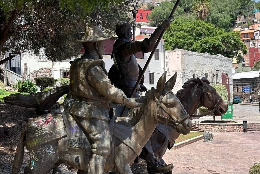 Frente al Teatro Cervantes, en Guanajuato capital, se encuentran estas esculturas a tamaño real de ambos personajes montados sobre sus cabalgaduras. Fueron colocadas en 1976, en...