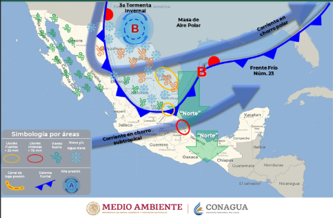 El sistema también ocasionará vientos intensos en diversos estados, con rachas que podrían superar los 70 kilómetros por hora, lo que incrementa la sensación térmica de frío. En tanto, en regiones del occidente, sur y sureste del país no se descarta la presencia de lluvias aisladas derivadas de la interacción del frente con otros sistemas atmosféricos.