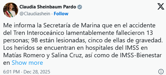 13 muertos en el descarrilamiento del tren Interoceánico en Oaxaca