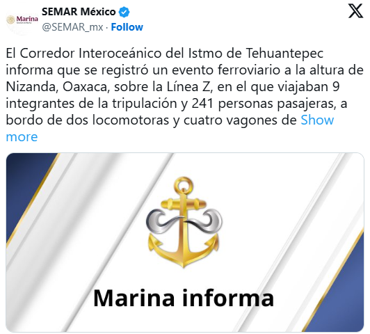 Oaxaca.- El 28 de diciembre el Corredor Interoceánico de Istmo de Tehuantepec informó que había ocurrido un evento ferroviario: el descarrilamiento del tren interoceánico con 240 pasajeros a bordo en dirección al puerto de Coatzacoalcos, Veracruz.