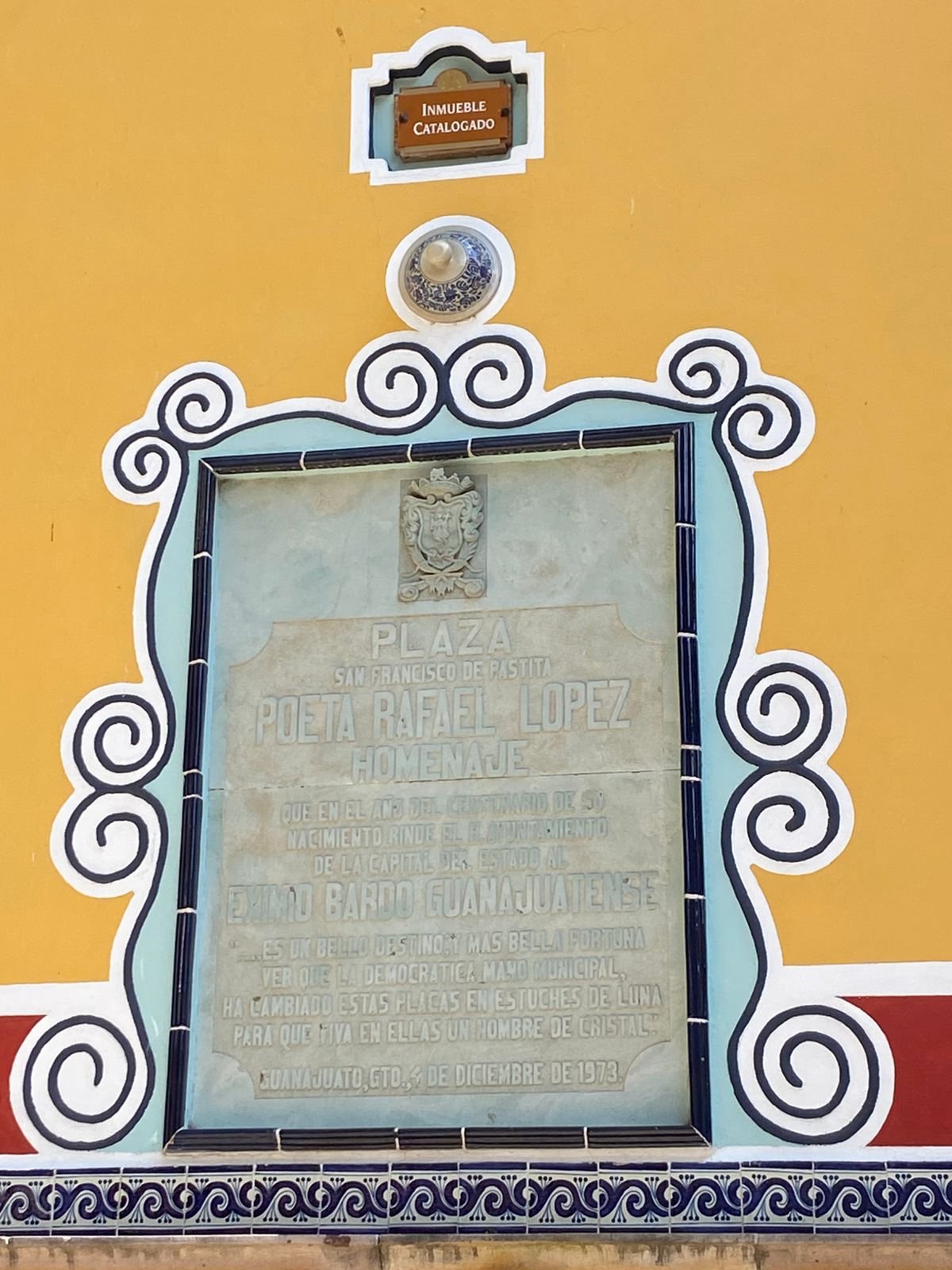 Guanajuato, Gto.- En la Plaza San Francisco de Pastita, ubicada en Guanajuato capital, se encuentra una placa conmemorativa dedicada a Rafael López, destacado autor modernista cuya obra forma parte del patrimonio literario nacional. El inmueble, señalado como catalogado, resalta por su valor histórico y artístico, convirtiéndose en un punto de interés cultural tanto para habitantes como para visitantes.