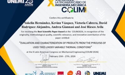 El artículo, titulado “Evaluation and Characterization of Products from the Pyrolysis of Used Tires under Variable Thermal Conditions”, fue desarrollado en colaboración entre investigadores del Departamento de Ingeniería Mecánica de la UG y la empresa Pirelli Neumáticos S.A. de C.V. La investigación contó con la asesoría del Dr. José Manuel Riesco Ávila y el Dr. David Aarón Rodríguez Alejandro, así como la participación de Kevinn Noé Vázquez Flores, la M.C. Victoria Paola Cabrera Madera, integrante del grupo de Investigación Combustibles Alternativos y Motores Térmicos CMT.UG, y Andrea Gianassi, representante de la empresa. Tras la evaluación del comité científico del congreso, el trabajo fue seleccionado como el mejor entre las propuestas presentadas.