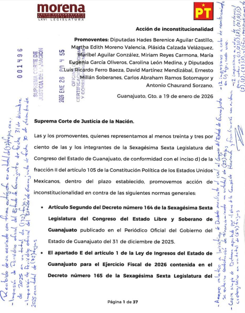 Morena impugna deuda de Guanajuato ante la Corte; acusan opacidad y “cheque en blanco”