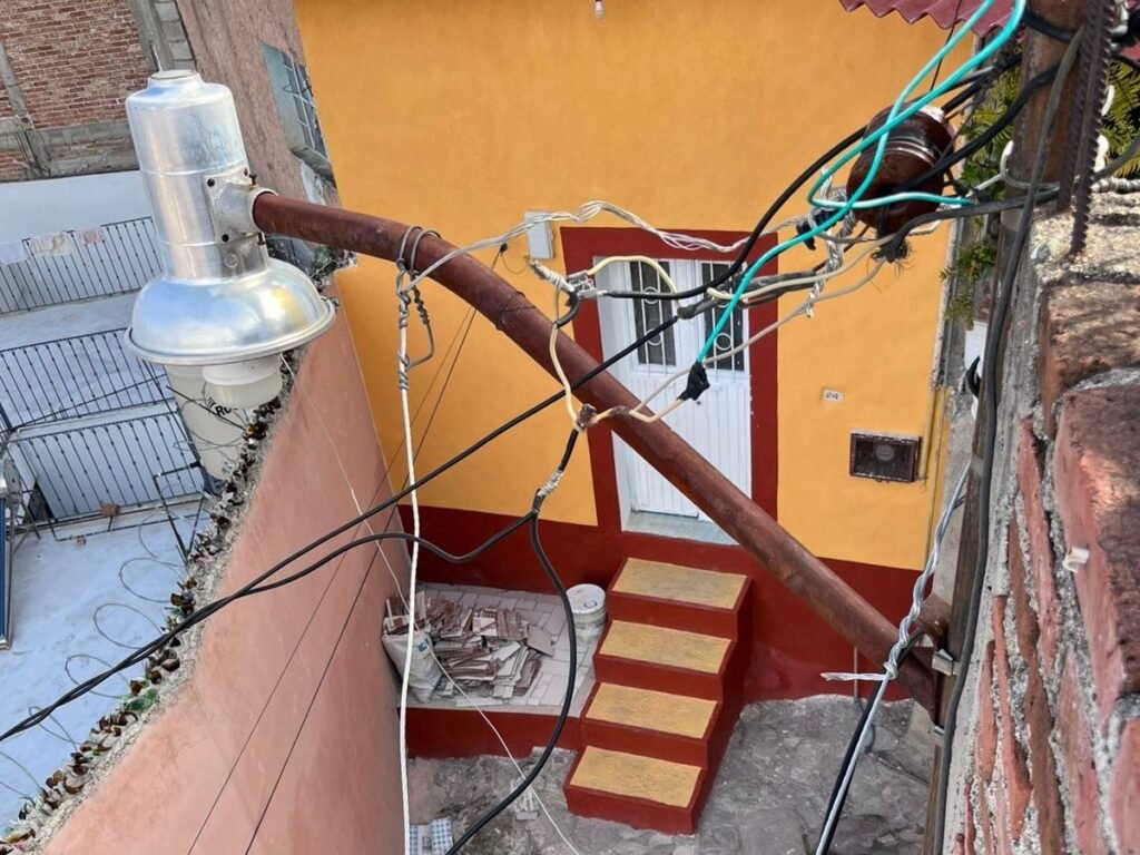 Los vecinos señalaron que uno de los postes, sobrecargado por el exceso de cableado, presenta una inclinación preocupante hacia una vivienda, además de que varios cables ya pasan por encima de balcones y fachadas. Esta condición genera temor ante un posible colapso, cortocircuitos o accidentes, especialmente durante la temporada de lluvias o fuertes vientos.