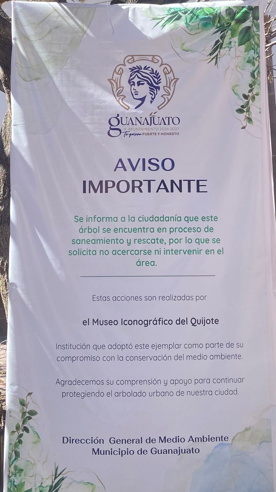 El Ayuntamiento de Guanajuato, a través de la Dirección General de Medio Ambiente, informó que un árbol ubicado frente al Museo Iconográfico del Quijote se encuentra actualmente en proceso de saneamiento y rescate, como parte de las acciones de conservación del arbolado urbano de la ciudad.
