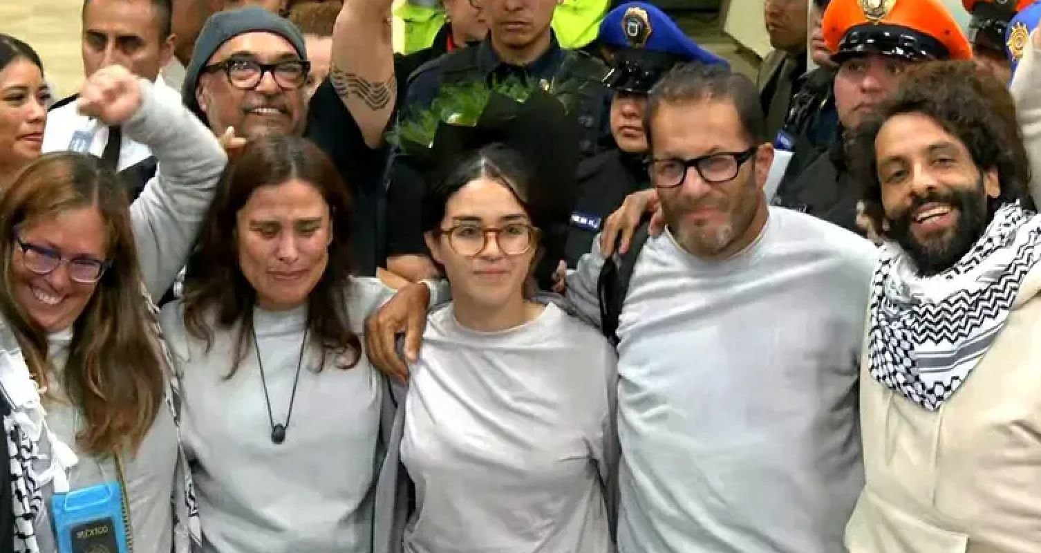 Los seis mexicanos que fueron detenidos por autoridades de Israel al participar en la Flotilla Global Sumud arribaron este 8 de octubre de 2025 a la Ciudad de México.