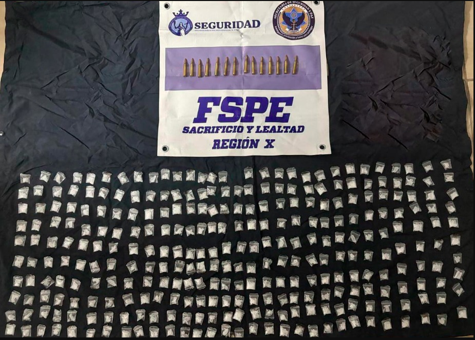 Durante la inspección preventiva, se aseguró una mochila tipo mariconera que contenía 300 bolsas transparentes tipo ziploc con una sustancia blanca y granulada, con características similares a la droga conocida como cristal, además de 15 cartuchos útiles calibre 5.56, considerados de uso exclusivo del Ejército.