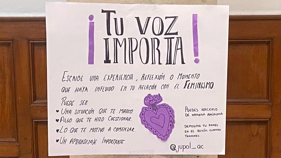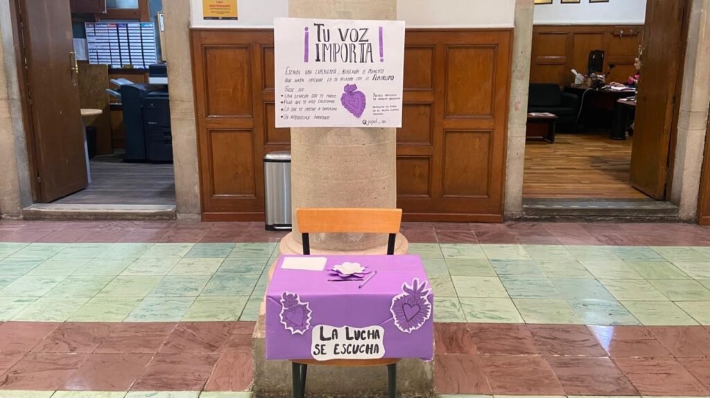 En el edificio central de la Universidad de Guanajuato, fue instalado un espacio participativo que busca dar voz a la comunidad universitaria bajo el mensaje “¡Tu voz importa!”. A través de una mesa intervenida con mensajes y materiales para escribir, se invita a las y los estudiantes a compartir experiencias, reflexiones o momentos relacionados con el feminismo.