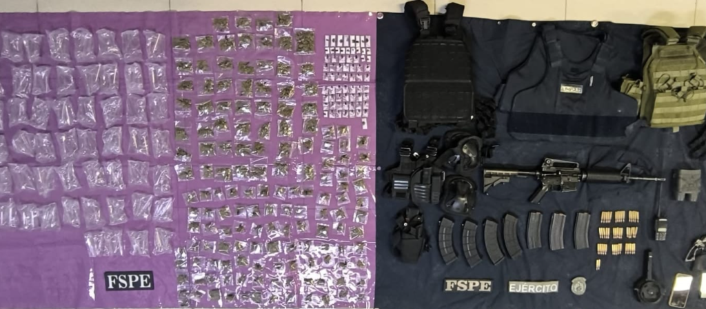 También fueron localizados cuatro chalecos balísticos con placas, un radio de comunicación, binoculares y tres rodilleras. En materia de narcóticos, se aseguraron 68 envoltorios con sustancia con características de cristal, equivalentes a 132 dosis, así como 150 bolsas con hierba verde y seca con características de marihuana, equivalentes a 419 dosis, lo que suma un total de 550 dosis de presunto narcótico. Además, se encontraron 156 pipas presuntamente utilizadas para su consumo.