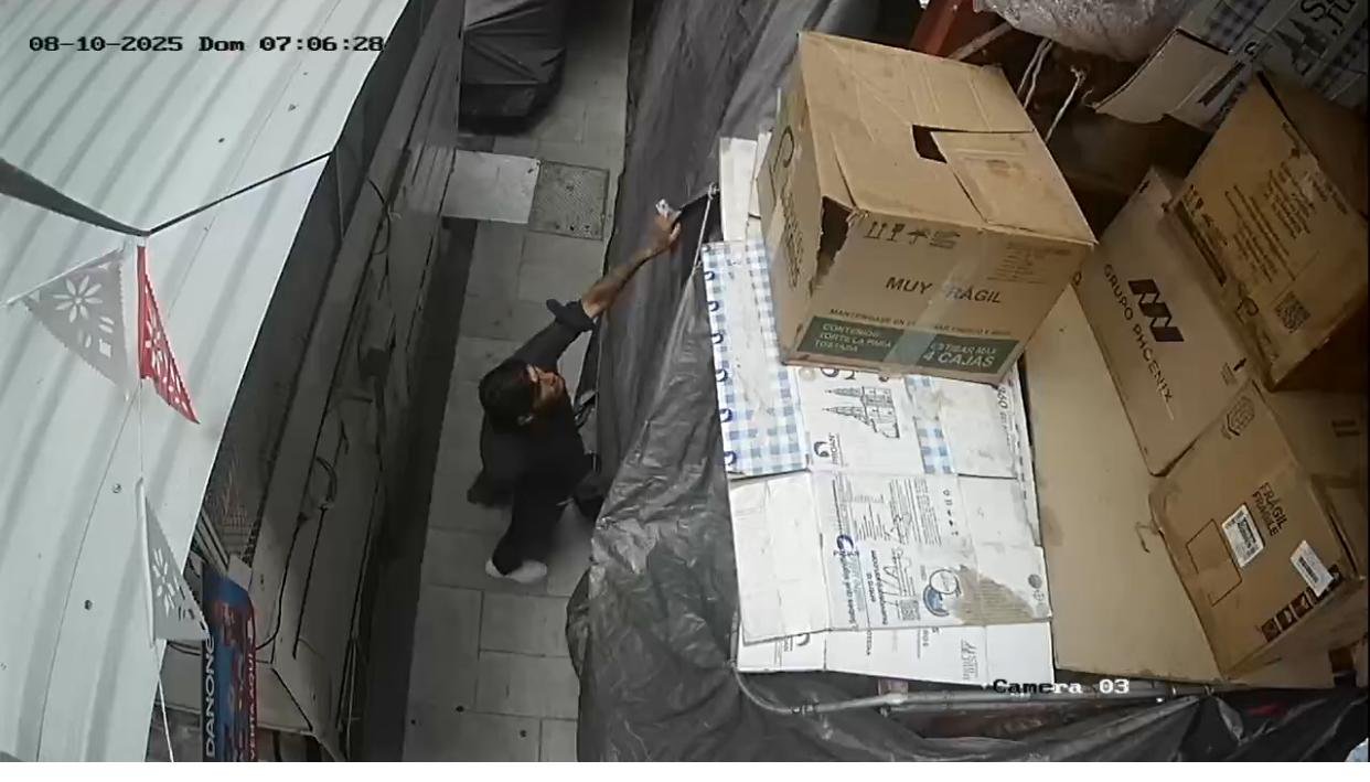 Aproximadamente a las 8:00 de la mañana, las cámaras de seguridad captaron a un sujeto vestido de negro ingresando por una de las tres entradas del mercado con claras intenciones de cometer un robo.